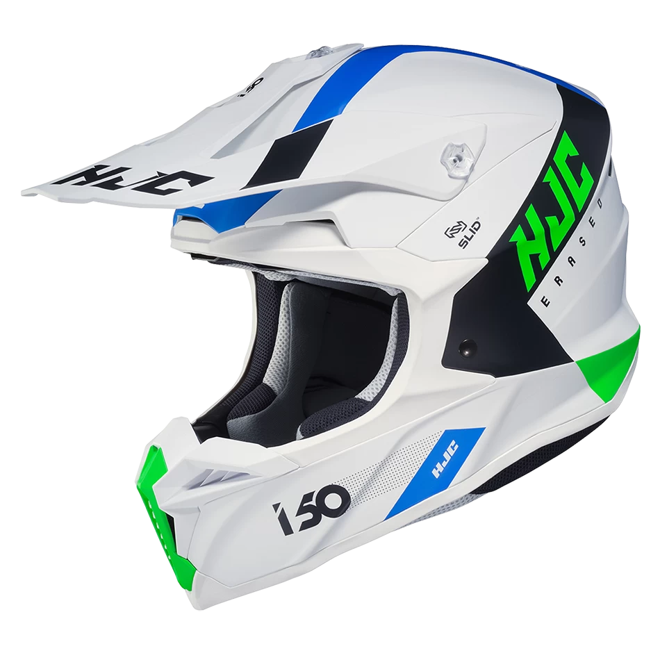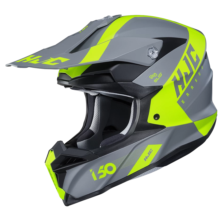 HJC’s new off-road helmet is designed to create ease and comfort for the rider in an aggressive and attractive design. A large, repositioned eye-port optimizes the view for downward visibility. Dual-position goggle band fitment adjusts for the rider’s comfort and preference. The extended visor blocks sunlight and protects the rider from debris and is flexible to allow the material to bend instead of break. The tool-less, changeable mouth vent allows for easy cleaning. “ACS” Advanced Channeling Ventilation system allows full front to back airflow to flush heat and humidity up and out, while the SuperCool® Interior keeps the rider cool and fresh with moisture-wicking and antibacterial fabric that is removable and washable. The i50 features SLID (Sliding Layer Impact Distribution), HJC’s impact distribution technology.